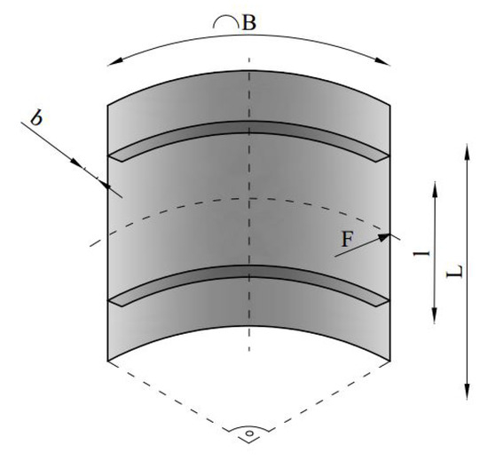 To assess the capability of the proposed scheme in a more challenging situation, we refer now to the section of a stiffened aircraft fuselage described in [37]. The structural part consisted of an external composite shell and of two aluminum circular stiffeners; to slightly simplify the original geometry, we did not explicitly consider the window hole, which can be fictitiously allowed for as a part-through damage. Accounting for the loading condition envisaged in [37] and represented by a concentrated load F, only one quarter of the whole section can be considered in the analysis, and symmetry boundary conditions were applied along the vertical edges of the model in Figure 5. The relevant model dimensions are detailed in Table 1.