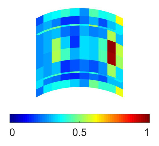 Concerning Case (2), the results of the multiscale investigation are collected in Figure 10, Figure 11 and Figure 12. As for Case (1), the objective function provided higher sensitivities close to the point of application of the external load, but at variance with the previous case, it is shown in Figure 11 that sensor placements were all located in the region between the two stiffeners, even for . Subsequent mesoscale analyses provided the results of Figure 12, where had been adopted as before.