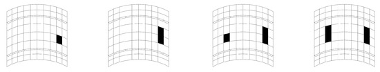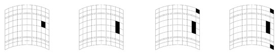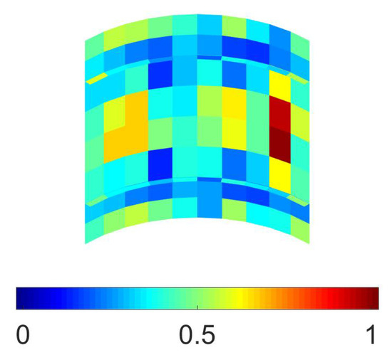 To explicitly define what the entries in vectors and , and have to represent of the structural responses, the sensors adopted should be taken into account; see e.g., [11,31]. As already pointed out in the Introduction, we refer here to lightweight structures like thin plates and shells, whose kinematics is mainly described by the displacement in the direction perpendicular to their (either flat or curved) mid-plane and by the rotations of segments perpendicular to such a mid-plane. For layered composite panels, the kinematics is usually more complex, due to the different mechanical response of typically anisotropic layers featuring their own spatial orientation; nevertheless, simplified solutions can still be obtained by managing the aforementioned kinematic variables only; see [32]. If sensors are supposed to be three-axis accelerometers, their capability to sense the gravity acceleration, and so their orientation relative to the gravity direction, can be exploited to sense the damage-induced change in the local rotation of the structural mid-plane. Accordingly, each vector representing the macroscale or mesoscale response to the external actions is assumed to collect the rotations about the axes of any local reference frame (typically one with two axes belonging to the mid-plane of the panel and one in the direction perpendicular to it), smeared at the element level.