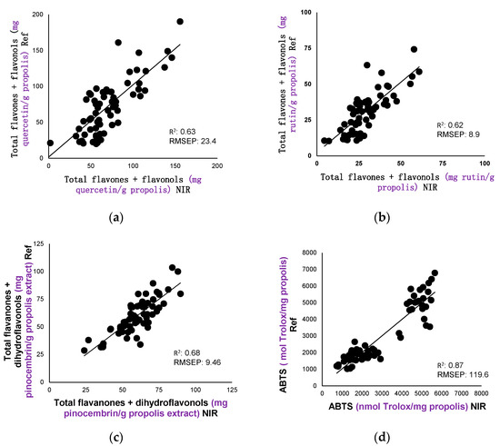 The results obtained indicate that given the high R2 values and the small calibration errors it is possible to determine the flavone and flavonol contentby means of NIR technology independently of the standard compound used for calibration, and the total flavanone and dihydroflavonol in concentrations similar to those found in spectrophotometry. For the determination of antioxidant activity using the ABTS method, the concentration margin is lower (0–3212.6 nmol of Trolox/mg of propolis), while in the case of thelinoleic/β-carotene method the margin of application of the model regarding the chemical data of reference clearly widens (22.7–86.8% inhibition).