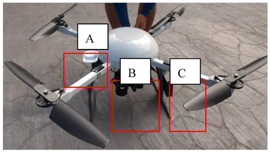 UAV established in this study. (A): the antaean; (B): XM6 thermal camera; (C): BD 970 GNSS OEM board.
