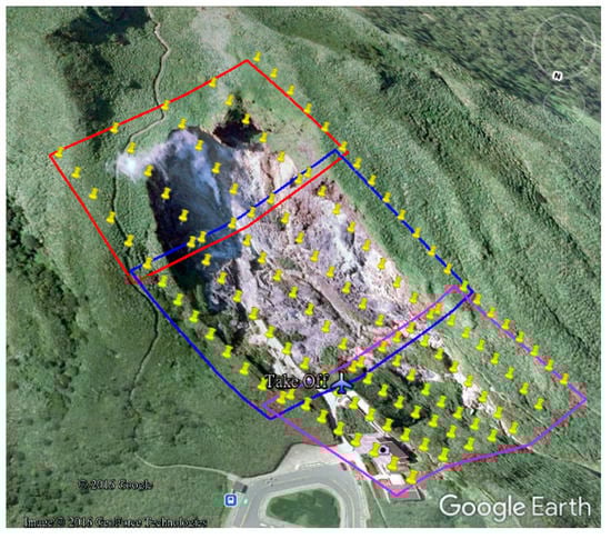 On the island of Taiwan, located at the earthquake zone of the western Pacific Ring of Fire, the Tatun volcano group (TVG) is the only one still displaying significant volcanic activity even though scattered volcanic rocks have been identified. Not only is it the biggest volcanic group, but it is also still active [18,19,20,21,22,23,24]. According to recent reports [22,25], the last eruption was within the last thousand years in the TVG. Thus, the possibility of a future volcanic eruption cannot be ruled out. The TVG is composed of more than 20 volcanoes, including Mts. Chishin, Tatun, Huangdra and Shamon. Volcanic geothermal activity is still very strong and a number of fumaroles and hot springs are present. One of the strongest geothermal activities is located at Hsiaoyukeng. Therefore, we have selected this area (ca. 0.7 hectares) as the study area, not only because of significant geothermal activity, but also because of the opportunity to demonstrate the advantages of Rotor-craft UAS in an area with highly variable topography. Figure 6 shows the study test area. Three distinct areas are designated with the UAV flying 220 m above average ground height to acquire thermal images with about 15 cm GSD. According to Section 3.2, the waypoints are designed as shown in Figure 6. The selected site for the vertical takeoff and landing is indicated with the airplane symbol in Figure 6.