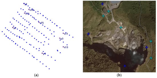 Ground control points (GCPs) and Check Points of GNSS-supported position and orientation of thermal images. GCPs: y1, y2, y3, y4 by stereo measurements from historic aerial stereo images; Check Points: 11, 13, 15, 16, 18 by the real-time kinematic (RTK) GPS Surveying method. (a) Locations of control points, check points and image centers, (b) Locations of control points, check points overlaied with Google Image.