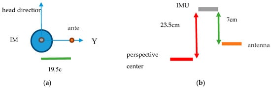 The offset illustration between IMU center and the antenna center. (a) Top view; (b) Side view.