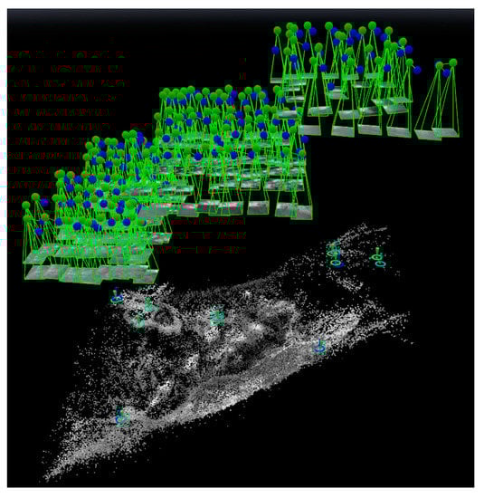 Figure 11 shows the result of position and orientation of thermal images determined by GNSS-supported self-calibration AT by reduced GNSS observations with four GCPs as controls.
