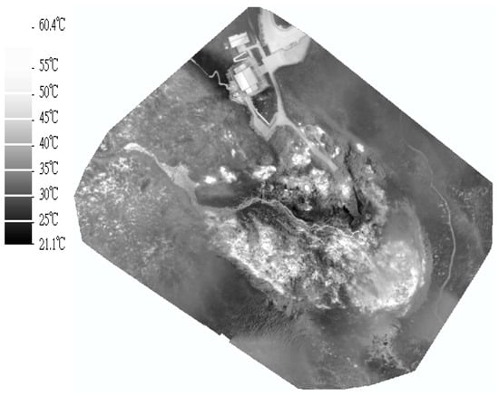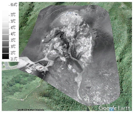 For geothermal applications using the UAS, Nishar et al. [9,10] used a small and cost effective quadcopter UAS with an FLIR Tau 320 camera to accurately map the physical and biological characteristics of unique habitats within the Wairakei-Tauhara geothermal field near Taupo, New Zealand. An area of about 700 m2 was flown and the images mosaic-ed using Pix4D (Pix4D, Lausanne, Switzerland) and ArcGIS 10.2 (ESRI, San Diego, CA, USA). The orthorectified image with 0.5 cm pixels size was used to show hot thermal anomaly. Based on the results of the studies by Nishar et al. [9,10], it is believed that remote sensing using a UAS could revolutionize the exploration of geothermal energy and the associated ecosystems, in spite of the battery life, navigation capabilities, and flight regulations limits. Harvey et al. [11] demonstrated that no technical barriers stand in the way of using UASs to produce accurate thermal maps in large and inaccessible geothermal areas. A 2.2 km2 georeferenced, temperature-calibrated thermal orthophoto of the Waikite geothermal area in New Zealand was presented in their study. Over a period of about 2 weeks, nearly 6000 thermal images were collected. This was also the first test to generate an orthomosaic image of a large geothermal area using a UAS equipped with a thermal camera. Recent advances in UAS technology, combined with lightweight thermal cameras provide a new tool for volcanic monitoring. Amici et al. [12] presented the preliminary results of a test on an Italian mud volcano using a multi-rotor aircraft in a hexacopter UAS. The UAV flew above the Le Salinelle mud volcano located on the lower South West flank of the Mt. Etna volcano. This was a representative site where activity proved to be related to the early stages of magma accumulation within the volcano. In their study, the in-flight measurements were used to cross-validate with in situ collection of thermal information and from independent temperature measurements of mud/water contemporaneously. Mori et al. [13] performed volcanic plume surveys using a multirotor UAS to collect data concerning plume gas composition, sulfur dioxide flux, temperature data, and a particle sampling of Japan’s Mt. Ontake on 20 and 21 November 2014, and on 2 June 2015. Together with the results of manned helicopter and aircraft observations, it was concluded that the plume of Mt. Ontake was not being directly emitted from the magma, but rather, was being influenced by the hydrothermal system.