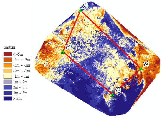 Because the thermal orthoimage is highly related to the quality of DSM, the quantitative analyses were first done with airborne LiDAR data collected in 13 May 2012. Figure 15 shows the quantitative analysis. This quantitative analysis was performed by the 3-D spatial analysis tools, subtraction of raster math, in ArcGIS software. Raster size was set to 0.5 m to perform this analysis of two DSMs. In the area surrounded by the GCPs (y1, y2, y3 and y4) (see red quad rectangles in Figure 15), the result obtained from thermal DSM elevations minus from LiDAR DSM shows that the difference between produced DSM and airborne LIDAR data is about 36% between −1 m to 1 m (see Table 5) and 66% between −2 m to 2 m and the larger difference about 29% is greater than 2 m (light blue or blue areas) located in grassy areas.