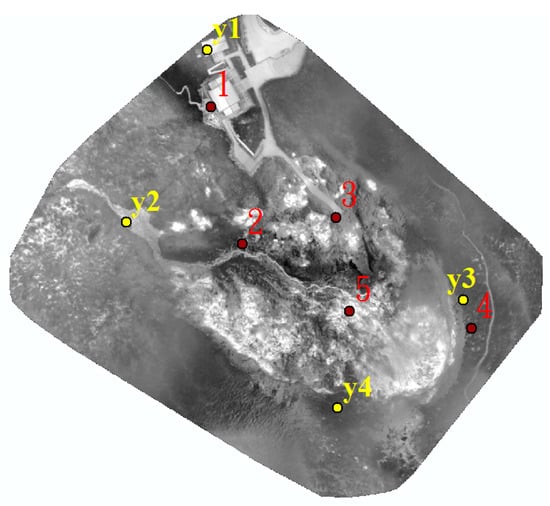 For further verification of the geometric accuracy of thermal orthoimages, the even distribution of 5 check points (see Figure 16) from historic aerial stereo images were measured. The planimetric discrepancy of each check point was calculated to check the results of the thermal orthoimages. The checked results are shown in Table 6. These show that the average discrepancy is 1.54 m, maximum discrepancy is 3.17 m, and the minimum discrepancy is 0.71 m. The planimetric accuracy is 1.78 m. The results prove the thermal orthoimage is sufficiently accurate for volcanic geothermal monitoring.