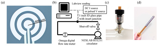 −6 Torr with deposition rates of 15 and 5 Å/s. The outside radii of the electrodes were 400 µm, 250 µm, and 100 µm. The sensor was integrated with PC board and inserted into a glass tube connected with a water pump (