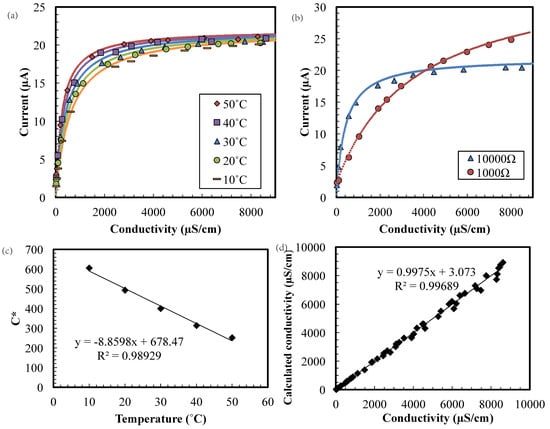 Figure 3c,d was the coefficient of determination of linear regression. The conductivity calculated using a rearranged version of Equation (3) (i.e., Equation (4)) then agrees very well with the measured conductivity (