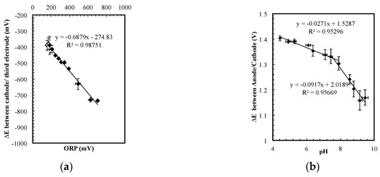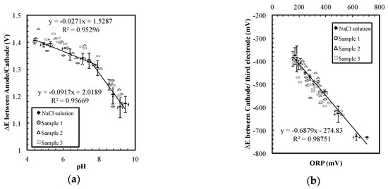 The ORP results suggest that the potential on the cathode remains relatively constant in the wide-ranging conductivity and ORP conditions. This steady cathodic potential implied that the potential difference between the anode and the cathode could be used to indicate pH. The data in