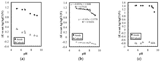 Figure 4b, the potential on the anode changed with pH, while the potential on the cathode remained relatively stable. The reaction on the cathode was presumably chloride adsorption on platinum surface, as listed in Equation (5) [