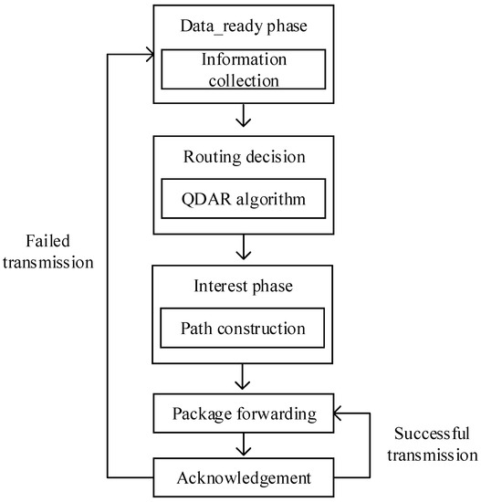 The QDAR mechanism is designed for the overall routing process. There are five phases in QDAR mechanism: data_ready phase, routing decision, interest phase, packet forwarding and acknowledgement. The data_ready phase is responsible for information collection, after which the sink node can get the fundamental information for routing decision. Then, the sink node determines the path according to QDAR algorithm. During the interest phase, the sink node sends a packet to the source node along the determined path. Thus, the path can be constructed. Packets are sent along the path thereafter as long as the acknowledgement phase is successful. Otherwise, the whole mechanism restarts. The main communication procedure is briefly depicted as Figure 1.