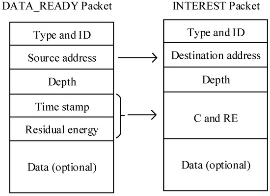 Packet structures for DATA_READY packet and INTEREST packet, which can help establish the routing track, are designed as follows. DATA_READY packet contains the type and ID of the packet, source node address (SNA), time stamp (TS), current node depth (CND) and two arrays C and RES in which two costs and residual energy of this node (RE) are saved respectively. SNA is permanent during the network lifetime of the packet. Elements of C are calculation results of two cost functions: delay-related cost and energy-related cost. Denoting the residual energy of node i as , we define the energy-related cost function as: