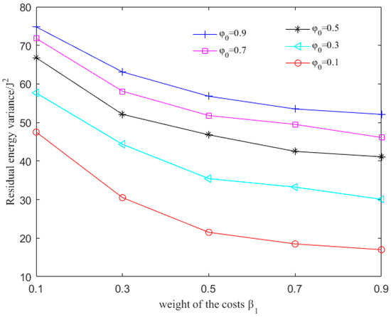 Variance of the residual energy with different values of , and .