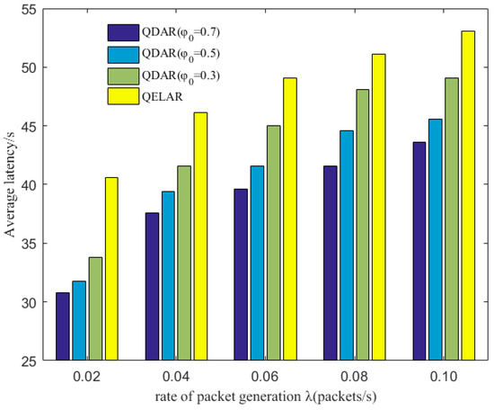 Average latency comparison between QDAR and QELAR with different packet generation rate λ (packets/s).