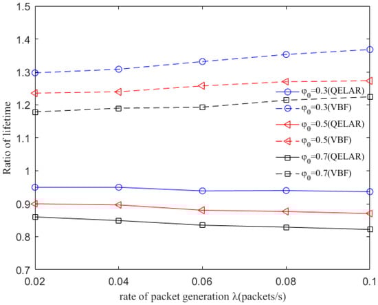 Lifetime ratios of QDAR and different routing protocols (QELAR and VBF) with different packet generation rate λ (packets/s).