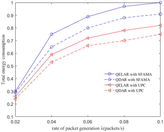 We next examine how the underlying MAC protocol layer affects the performance of QDAR and QELAR in terms of total energy consumption. The slotted floor acquisition multiple access (SFAMA) MAC protocol [26] and underwater power control (UPC) MAC protocol [24] are used for QDAR and QELAR, respectively. The results are shown in Figure 7, where the total energy consumption is normalized to (0, 1). As QDAR restricts routing decision with end-to-end delay, some packets may detour with more hops in QELAR than that of QDAR. More nodes forwarding packets means more total energy consumption. Thus, QELAR consumes more energy than QDAR regardless of the MAC protocol used. Besides, we can see that routing algorithms with UPC can achieve lower energy consumption than those with SFAMA. The reason is that UPC can reduce the transmission power level to achieve a better energy efficiency as well as smaller interference range. Moreover, as UPC can deal with the noise, interference and spatial channel reuse, QDAR do not need to pay much attention to these problems. Therefore, using UPC as the underlying MAC protocol, QDAR can prolong the network lifetime more efficiently.
