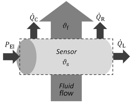 with the mass and the specific thermal capacity of the resistor, the temporal gradients of the sensor temperature , the convective heat flux , the conductive heat flux , and the radiative heat flux (Figure 2). The dominating mechanism is the convective heat transfer