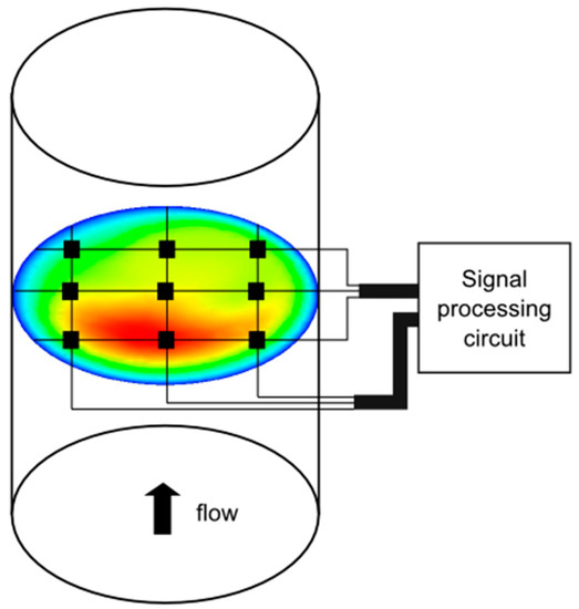In electrical grid sensors, each cross-point sensor element is typically excited by a voltage on one of the connecting wires (transmitter) while the other connecting wire (receiver) is used to measure the transmitted electrical current; furthermore, current excitation and voltage measurement is also possible. Moreover, DC and AC excitation schemes can be used, of which the most prominent is the wire-mesh sensor where wires form a simple grid with no further sensor elements, and the electrical properties of the fluid in the wire crossings can be measured in this way. Measuring electrical conductivity gives rise to a conductivity wire-mesh sensor [4], while an AC-based capacitance measuring scheme can be used for non-conducting fluids [5]. Hence, for a wire-mesh sensor, the fluid volume in the wire crossing is itself the sensor element. While wire-mesh sensors can measure phase fractions (e.g., in gas/water or gas/oil flows), they cannot directly measure continuous phase velocities.
