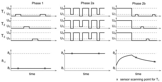 - For the alternative thermal transient anemometry (TTA) mode, the resistors were heated simultaneously by application of to all transmitters. After a sufficient heating time, but not necessarily up to equilibrium temperature, the heating voltage was switched off and the time constant of the temperature drop during the cooling period was measured by the sequential application of to the transmitters. The ratio of the durations between the heated and the unheated phase as well as the resulting sampling time is dependent on the thermal relaxation time of the resistors.