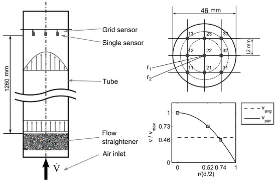 with , the radial position , and the tube diameter [14]. Experimental investigations were performed in a tube flow channel with an inner diameter of . An air flow at room temperature () was controlled via a mass flow controller and varied between and (reference condition , ). This corresponded to a maximum average flow velocity of and a Reynolds number of regarding the inner diameter . The tube was orientated in a vertical direction. For flow homogenization, a flow straightener sponge was mounted at the inlet (Figure 7, left). To ensure a fully developed parabolic flow profile at the measurement plane, the hydrodynamic entrance length exceeded the recommended minimum entrance length of 1156 mm.