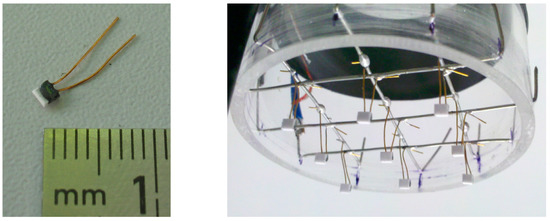 The demonstrator TAGS was a 3-by-3 arrangement with nine sensor elements (Figure 7, top right and Figure 8). The center crossing point (22) was concentric to the tube. The distance between the parallel wires was . The radial positions of the eccentric measurement points were and . The platinum resistors had dimensions of by by with a nominal resistance of at the reference temperature where planar surfaces were orientated longitudinal to the flow direction. The theoretical flow velocities from Equation (7) were , , and (Figure 7, bottom right). Applied voltages for temperature measurement were and for heating . To exclude the influence of the wire resistances on the temperature measurement, the demonstrator TAGS was calibrated in a climate chamber in a range between and in steps of .