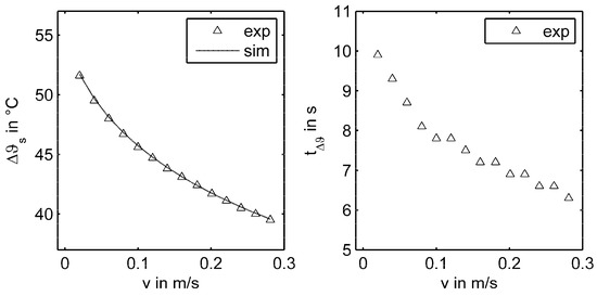 The results for both CVA and TTA operation modes of the central sensor element S22 are shown in Figure 10. On the left side for CVA, was plotted as a function of the flow velocity. With increasing flow velocity , the overheating decreased. Aside from the experimental results, the simulated characteristic curve resulting from the presented heat balance model for sensor S22 was plotted. It was evident that the curve calculated from Equation (18) was in very good agreement with the experimental data. On the right side of Figure 10, the characteristic cooling times (determined via the TTA mode) for the same velocity points were plotted. With increasing flow velocity , the cooling time decreased.