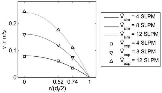 With the model, a set of calibration curves for all sensors Sij at the radial positions and were calculated by adjusting and . Thereby, the flow velocity was calculated from the measured overheating . In Figure 11, the theoretical parabolic velocity profiles calculated from Equation (7) were plotted for three different volumetric flow rates. Furthermore, the determined velocities from the measured of the sensors at three radial positions are shown. This demonstrated that the flow profile in the pipe was measured correctly with the prototypical TAGS.