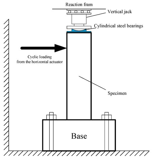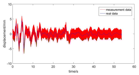In order to verify the effectiveness of the proposed algorithm, experimental data from the test of a reinforced concrete structure was adopted. The configuration of the experiment is shown in Figure 2. It was a quasi-static test for the column made by Chinese Grade 345 steel and C30 Grade concrete []. During the experiment, the column was tested under constant axial load and cyclic bending. Through this experiment, deformation displacement at different time samples were obtained, which correspond to the measurements in the proposed algorithm. Although the entire data was ready before denoising as well, the process was implemented in an ‘online’ mode, i.e., only the measurement of the ‘current’ sampling time and previous result would be used in computation. The necessity of the online mode for this background is because the actual value of the measured state has great effect on the identification of the structure security, and it needs to be known during the monitoring process. In this experiment, the sampling time was set as 0.001 s.