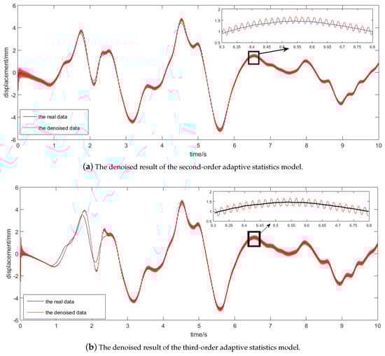 The performances of the second-order and the third-order adaptive methods for online denoising were compared in this part. The denoised results are shown in Figure 4. Since the difference was too small, we provide a detailed part of the curves in the small picture, and 500 points from 6.3 s to 6.8 s are shown there. The results demonstrated that this algorithm is feasible and reliable with reasonable precision. Furthermore, through comparing the real data and the denoised data, the satisfactory denoising effect of the second-order adaptive statistics model was illustrated.