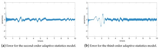 Comparing the second-order and third-order adaptive statistics models, we can find a satisfactory denoising effect in Figure 4a,b. However, from the result before 3 s, we might notice the third-order adaptive statistics model performs with poorer precision. Thus, the second-order adaptive statistics model can have advantages with respect to accuracy. Meanwhile, in order to better describe the error and compare the denoising precision, Figure 5 gives the error of the both models.