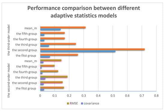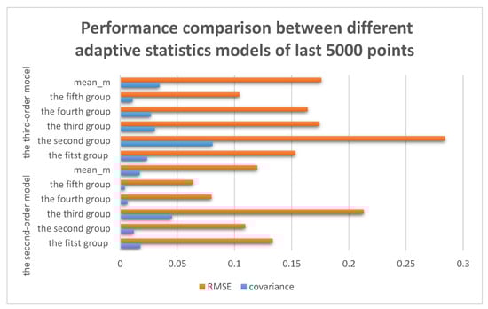 Based on the results in the Table 1, it can be clearly seen that the second-order adaptive statistics model is better than the third-order one, because it provided better precision and faster speed in online denoising. Meanwhile, as we can see in Figure 6, more stable denoising effect and smaller RMSE can be offered by the second-order statistics model, in which the ‘orange column’ is the RMSE and the ‘blue column’ is the covariance for each group.