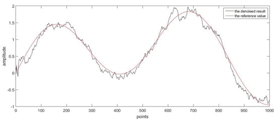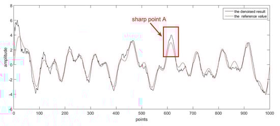 For the second group of data with noise, as was shown in Figure 12, the denoising method was applied again. The difference between the denoised result and reference values was given in Figure 10. It can be seen in the figure that the overall trend of the curve was in good accordance with the reference values, and the oscillation was because some features of the noise was reserved due to a high-dimension process model.