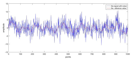 The first group of data with noise is given in Figure 11, where the reference curve was totally drowned. With the proposed online denoising method, the estimated curve in Figure 9 could be derived. According to the comparison with the reference curve, the original noised signal was successfully processed.