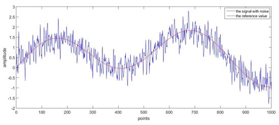Firstly, as a good denoising method, it should be able to deal with various kinds of data. In order to prove this, two groups of superposed sinusoidal signals with colored noise were adopted. The sampling time for both groups was 0.001 s. The main difference between the two reference curves was that one had more sharp points while the other changed more gently, and the curves were shown respectively in Figure 9 and Figure 10 for comparison purpose.