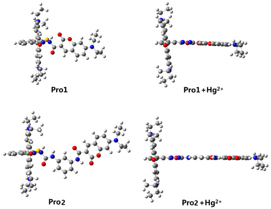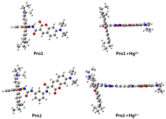Molecular structures of Pro1, Pro1 + Hg2+, Pro2 and Pro2 + Hg2+.
