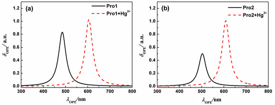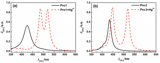 The OPA spectra of (a) Pro1 and Pro1 + Hg2+, (b) Pro2 and Pro2 + Hg2+ with PCM simulating the dielectric of water.