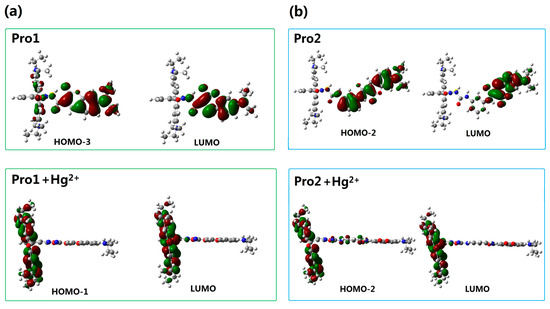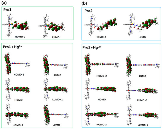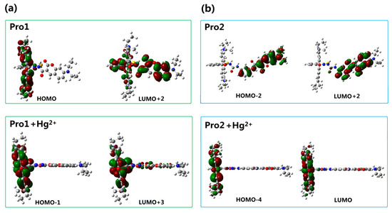 Molecular orbitals involved in the transition of the TPA peaks for (a) Pro1 and Pro1 + Hg2+, (b) Pro2 and Pro2 + Hg2+ with PCM simulating the dielectric of water.