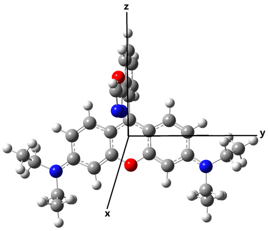Ideally, the transition dipole moments of donor emission and the acceptor absorption should have large vectors in the same direction, which is beneficial to the long-range dipole-dipole interaction. Here as shown in Figure 8, the X-axis is set to be perpendicular to the plane of the xanthene in rhodamine, the Y-axis on the long axis direction of the xanthene, and the Z-axis on the short axis of the xanthene. After fixing the coordinate direction, the transition wavelength, the corresponding strength and dipole moments for both the emission of the donors and the absorption of the acceptor (open-ring rhodamine) are calculated and the results are listed in Table 3. One can see that the emission wavelength of the donor for Pro2 is much closer to the absorption wavelength of the acceptor part than that for Pro1. Thus, spectral overlap between the donor emission and the acceptor absorption for Pro2 + Hg2+ is large while that of Pro1 + Hg2+ is small, proving the recognition mechanisms of Pro2 + Hg2+ to be FRET. In addition, there are large transition dipole moment vectors in the Z direction for the donors of Pro1 and Pro2, whereas the maximum transition dipole moment of the acceptor part is on the Y direction.