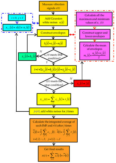 - Some Gaussian white noise sequences are added to the original signal respectively. The j-th white noise adding is taken as an example. A white noise nj(t) is added to the original signal x(t), which is expressed as:In the equation, nj(t) means adding the j-th white noise. j means the sequence of adding white noise. J denotes the total number of additions of white noise. xi,j(t) represents the i-th order signal decomposed after the j-th adding noise. i expresses the sequence of intrinsic mode function (IMF) components obtained via EMD after addition of one noise. I is the total number of IMFs.