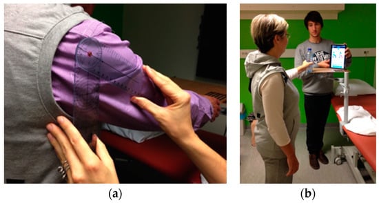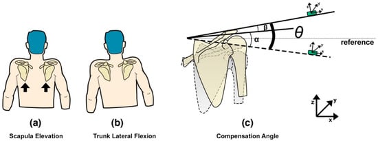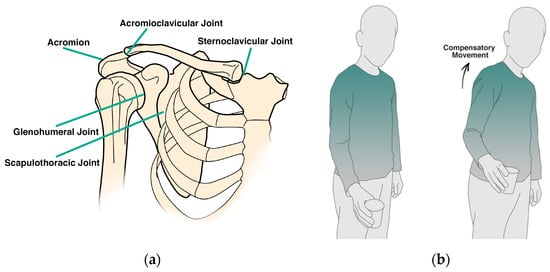 The complex movement of the shoulder (see Figure 1a) involves a combination of movements in the scapulothoracic, acromioclavicular, sternoclavicular, and glenohumeral joint. Alterations in trunk and scapulothoracic posture and movements, and in scapulothoracic muscle timing are related to the development of shoulder pain and dysfunctions, both in musculoskeletal and neurological (i.e., stroke) patients [,,,]. In reaction to pain or in order to unload painful structures, patients tend to develop altered movement patterns which can be seen as compensatory movements []. For example, in the performance of reaching tasks, patients with shoulder pain at the level of the glenohumeral joint, might develop aberrant movement patterns at the level of the scapulothoracic joint, in order to compensate for limited glenohumeral motion (see Figure 1b). This can be seen in the form of increased scapular elevation in the frontal plane or increased trunk lateral flexion. Compensations might also occur in the sagittal plane, i.e., scapular protraction or trunk flexion []. While compensatory movement helps patients to achieve their tasks, it can also obstruct the recovery progress and induce new orthopedic problems. In light of this, detecting and preventing compensatory movements warrants particular consideration for technology supported physical therapy treatment.