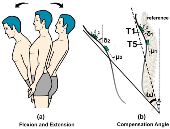 Compensatory movement from the trunk is defined as the additional trunk flexion (anterior displacement), shown in Figure 3a. Two FLORA 9-DOF IMU sensors (Adafruit, New York, NY, USA) are used to evaluate the trunk posture in terms of flexion/extension accurately. The two sensors are positioned on the spine (C7/T1 and T4/T5) (Figure 3b). Sensor locations were based on the evaluation of the initial versions of the Smart Rehabilitation Garment system (reported in []). For detecting compensatory trunk movements in the flexion/extension direction, the average of the angles of the sensors with respect to the sagittal plane is calculated, which provides an indication of the upper thoracic angle (see Figure 4b). When the angles obtained from the IMUs (Inertial Measurement Unit) are δ and μ, then the average of δ and μ represents the estimated thoracic neutral angle Δ, and the compensation angle is the thoracic flexion angle ω, estimated as the average variance of δ and μ. Trunk sensor readings with respect to the sagittal plane are described using Euler angle sequence of rotation around the global axis X.