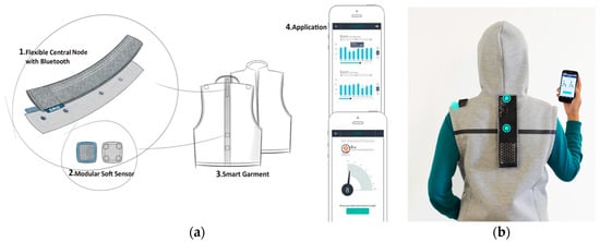 System concept overview of Zishi: (a) Concept illustration; (b) User wearing the garment, blue dots show the sensor positions.