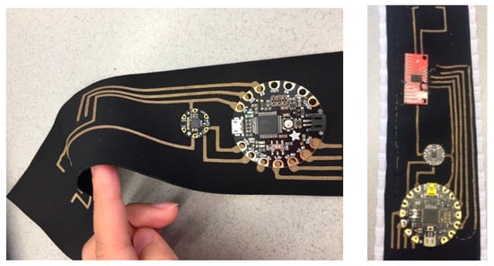 The flexible central node consists of the following components: (1) Two IMU sensors; (2) a multiplexer board to support multiple sensors in the system; (3) a Bluetooth module for wireless communication between the microcontroller and smart device; (4) FLORA, an Arduino-compatible microcontroller to which all other components are connected to; (5) 3V lithium battery. A laser-cut conductive textile pattern was applied as the flexible traces to connect the electronic components (shown in Figure 5).
