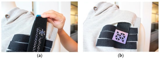 Addressing the proposed design criteria, a dedicated garment design is essential to integrate all the parts in the systems. Instead of the earlier 2-piece design [,] in which the different garment parts were attached to each other with a Velcro strip, we opted for a zipped vest of soft material, which is easier for patients to put on and take off. In order to guarantee a precise sensor placement over time in the pre-defined position, the sensor is flat (height 0.8 mm, diameter is 16 mm) and sewn by coated conductive yarn on a soft elastic strap (Figure 6a) with a Velcro fastened at its end. One side of the strip was fixed on the garment while the other side was flexible for adjustment (Figure 6b). Thanks to the adjustable design, the sensor could be located at the flat part of acromion. The movement of the acromion during the exercises is very limited, i.e., the exercises’ aim is to keep the scapulothoracic joint still (setting phase—scapulothoracic motor control exercise) while the arm is elevated (in the limited range of motion that is possible without scapulothoracic movement). In this way, the accuracy was ensured by the sensor position and the fit design of the garment (in different size and Velcro fix). This allows to adjust the sensor placement to people with different body sizes.
