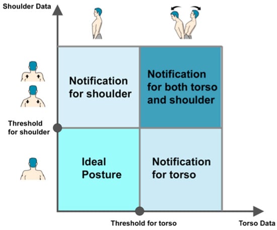 Feedback is important during rehabilitation training, for speeding up learning processes, for augmenting treatment effects and sustaining motivation []. Zishi provides both Knowledge of results and Knowledge of performance feedback [], the latter consisting of real-time kinematic feedback (e.g., shoulder girdle elevation value) and notifications of posture deviations beyond a preset threshold. Zishi provides continuous feedback by means of visual and auditory information through a connected handheld device (smartphone or tablet), and vibration notifications delivered through the garment. The system is able to notify patients when the readings of the sensors exceed their personalized bandwidth. The sampling frequency of the sensor system is 50 Hz, while the frequency of the visual display (pointer rotation) was set at 30 Hz because of the data synchronization with the smartphone to ensure a smoothly visual display. During the experiment, subjects performed the tasks in a controlled manner (i.e., no explosive movements), similar to their daily training. In this way, the system is capable of monitoring the posture in real-time and providing subsequent feedback with inconspicuous delay. A therapist can calibrate the device to the patient by identifying a neutral shoulder girdle and trunk postures for this patient and, depending on the goals and progress of training, set a personalized training bandwidth around this position that corresponds to the allowed compensation range. The neutral position (the position in which we calibrate) is the midstance between protraction and retraction, and the midstance between elevation and depression. This procedure works for patients in different pathologies and health conditions. Figure 7 illustrates the feedback strategy overview. Contrary to posture monitoring devices that are currently available, supporting consumer technologies, setting personal thresholds is an important step that should ideally be carried out together with the therapist.