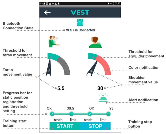 Figure 9c shows the interface during the actual training after the “start” button has been pressed. The green region in the dial shows the intended training bandwidth area. Patients can watch the screen while training and can see whether they compensate excessively and perhaps try to adjust their movement not to exceed the allowed range. The remaining grey part of the dial will turn red if the pointer exceeds the threshold. At the same time, an alarm icon will appear for 2 s with an audio alert and vibration notifications on the corresponding part of the garment. In this way, users can be made aware of their compensatory movements and learn to control them. The customized threshold setting serves as a reference target for each motion cycle. Providing real-time feedback, we aim to support correct movement execution and enhance motor learning, and thereby training effectiveness.