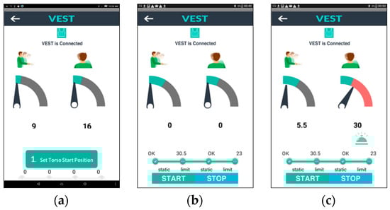 During the first stage (a) the user starts the system which pairs the App to the garment automatically. The user’s movements are visualized by a rotating pointer and a numerical reading, presenting the movement angle for flexion/extension of torso and the elevation/depression of shoulder.