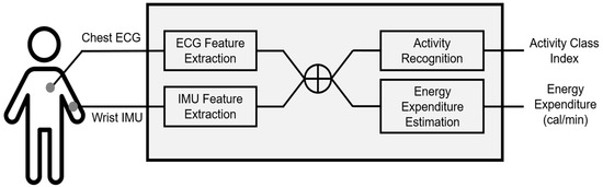 Based on these findings, we hypothesized that features extracted from ECG and accelerometer signals can be commonly used for both HAR and EE estimation, which enables to develop the integrated healthcare monitoring system with both functions. Therefore, we suggest a novel approach simultaneously taking HAR and EE estimation into considerations based on both accelerometer and ECG. Figure 1 describes the proposed system. Features extracted from ECG and accelerometer signals respectively are concatenated and then input to each module of HAR and EE estimation. The sensor locations in Figure 1 correspond to the database collected in this study and is not limited to these locations in the proposed system.